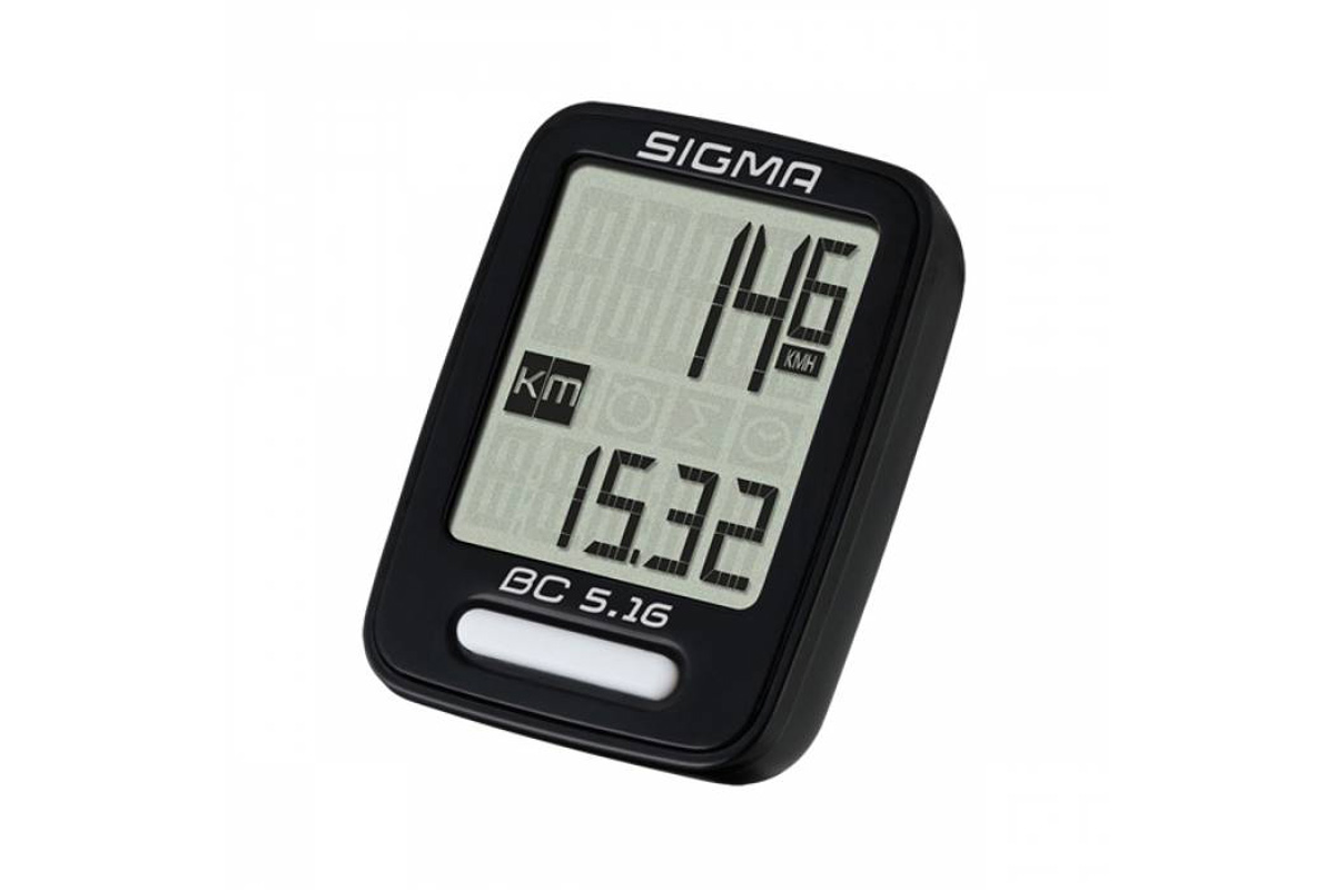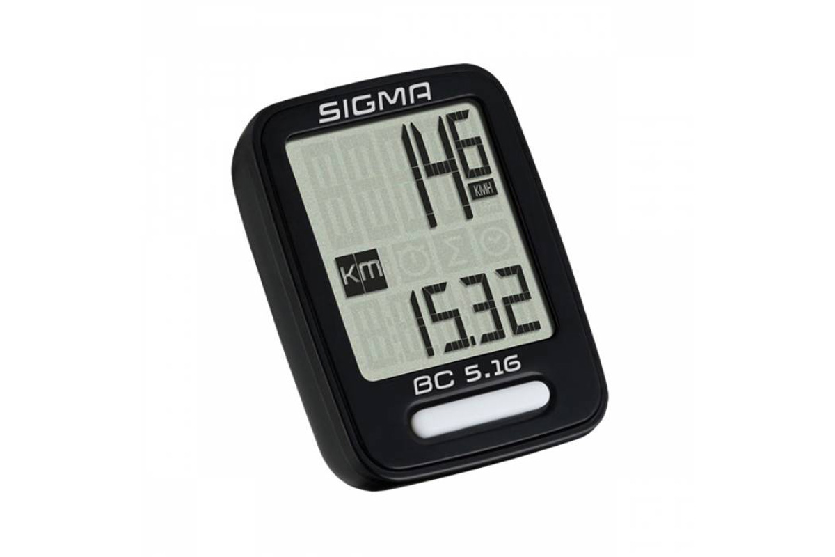 • Проводной велокомпьютер Sigma BC 5.16 отображает, основные пять характеристик: пробег поездки, общий пробег, текущая скорость, время поездки, часы.